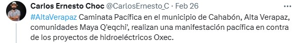 “#Alta Verapaz Peaceful Walk in the municipality of Cahabón, Alta Verapaz, Maya Q’eqchi’ communities, hold a peaceful demonstration against Oxec hydroelectric projects.