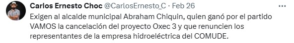 They demand from the municipal mayor Abraham Chiquin, who won for the VAMOS party the cancellation of the Oxec 3 project and that the representatives of the COMUDE hydroelectric company resign.”