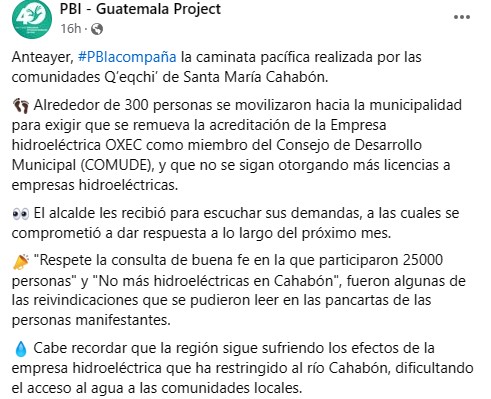 The Peace Brigades International-Guatemala Project has previously explained: “The Peaceful Resistance of Cahabón is made of more than 190 Q’eqchi’ communities who live in the Cahabón River basin. Since 2015 they have organized around defense of territory and against the launch of the OXEC I and OXEC II hydroelectric projects installed on the Oxec River, a tributary of the Cahabón River.”