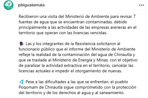 “A week ago PBI accompanied the Peaceful Resistance of the Poqomam People in Chinautla. They received a visit from the Ministry of Environment to review 7 water sources that are contaminated, mainly due to the activities of sand mining companies in the territory that operate with expired licenses.
