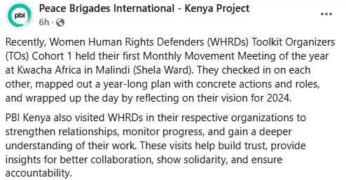 PBI Kenya also visited WHRDs in their respective organizations to strengthen relationships, monitor progress, and gain a deeper understanding of their work. These visits help build trust, provide insights for better collaboration, show solidarity, and ensure accountability.”