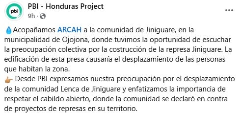 From PBI we express our concern for the displacement of the Lenca community of Jiniguare and emphasize the importance of respecting the open council, where the community declared against dam projects on its territory.”