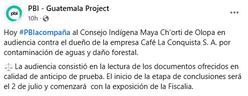 “Today #PBI accompanied the Maya Ch’orti’ Indigenous Council of Olopa at a hearing against the owner of the company Cafe La Conquista S. A. for water pollution and forest damage.