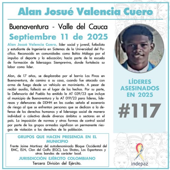 And it provides this important context: “The reactions following the murder of Alan Valencia Cuero have highlighted the seriousness of the violence faced by youth in some regions of Colombia and have revealed the urgency of implementing effective measures to protect the lives of young social leaders. …The murder of Valencia Cuero was the 117th case of social leaders murdered in Colombia so far in 2025.”