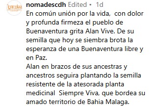 “In common union for life, with pain and deep determination, the people of Buenaventura cry out, ‘Alan Lives’. From the seed that is sown today springs the hope of a free and peaceful Buenaventura.