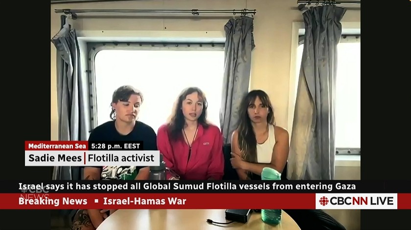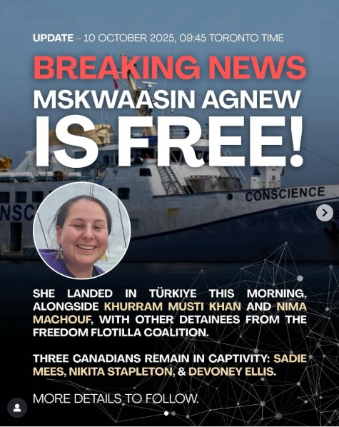 Radio Canada reports that Cree/Dene land defender Mskwaasin Agnew has been released and is now in Türkiye after the Gaza aid flotilla she was participating in was intercepted in international waters by the Israeli military on October 8.