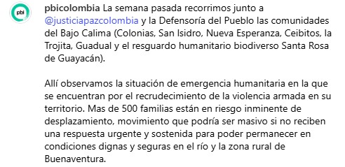“Last week, together with @justiciapazcolombia [the Inter-Church Justice and Peace Commission] and the Ombudsman’s Office, we visited the communities of Bajo Calima (Colonias, San Isidro, Nueva Esperanza, Ceibitos, La Trojita, Guadual, and the Santa Rosa de Guayacán biodiverse humanitarian reserve).