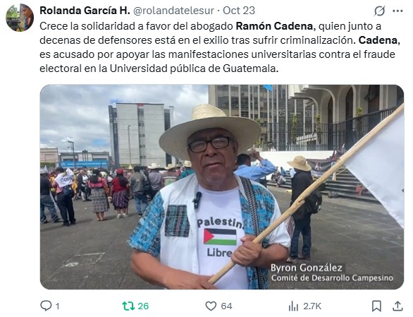 Video: “Solidarity is growing in favor of the lawyer Ramón Cadena, who, along with dozens of defenders, is in exile after suffering criminalization. Cadena is accused of supporting the university demonstrations against electoral fraud at the public University of Guatemala.”