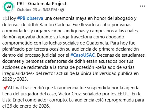A statement posted on the Front Line Defenders website further explains that “dozens of human rights organizations” were concerned about “the judicial hearing scheduled for 23 October 2025 against the lawyer and human rights defender Ramón Cadena Rámila, in the case labelled by the Public Prosecutor’s Office as ‘Botín Político USAC’ [Political Spoils University of San Carlos in Guatemala].”