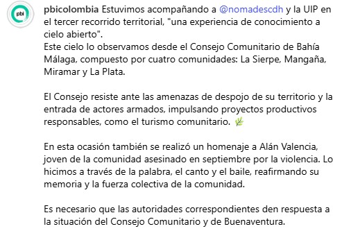 El Tiempo also noted: “Following the young man’s murder, the Community Council of Black Communities of Bahía Málaga issued a statement in honour of Valencia Cuero. It reads: ‘Our reborn people deserve to live in peace. Alan’s departure leaves a huge void in the territory. His legacy, his struggle and his love for life and the land will continue to guide our steps. We will continue to resist, for memory, for life and for the territory!’”