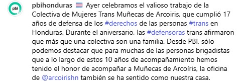 “Yesterday we celebrated the valuable work of the Muñecas de Arcoiris Trans Women’s Collective, which has been defending the rights of trans people in Honduras for 17 years. During the anniversary, the trans defenders affirmed that they are more than a collective, they are a family. At PBI, we can only emphasise that for many of the brigade members who have had the honour of accompanying Muñecas de Arcoíris over the last 10 years, the @arcoirishn office has also felt like our home.”