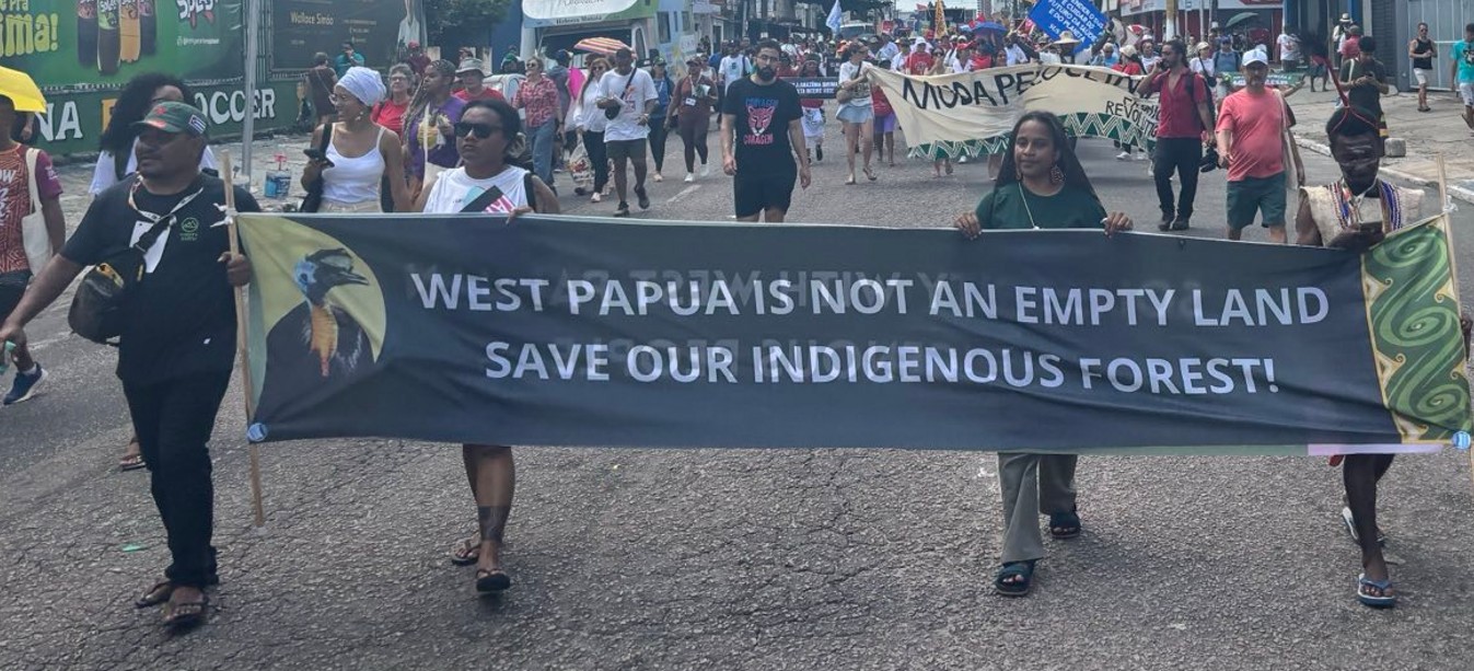Indigenous West Papuan environmental defenders Teddy Wakum and Dina Danomira participated in the Great People’s March in Belem, Brazil yesterday (Saturday November 15) in the context of the ongoing United Nations COP30 climate summit.