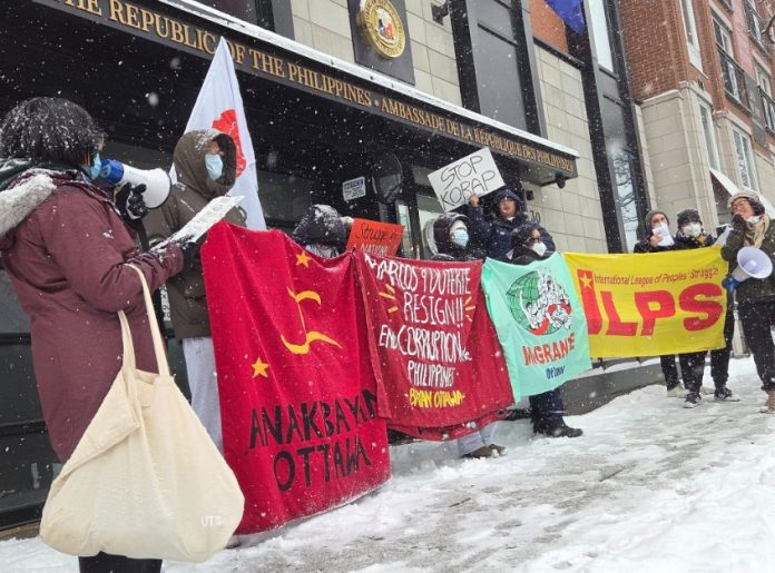 Here in Ottawa, groups including Anakbayan Ottawa, the Ontario Committee for Human Rights in the Philippines (OCHRP), Migrante Ottawa, the International League of Peoples’ Struggle (ILPS), gathered first adjacent to the US Embassy then in front of the Embassy of the Republic of the Philippines to participate in this day of action.