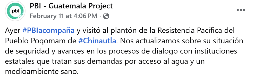 “Yesterday, #PBI accompanied and visited the encampment of the Poqomam People’s Peaceful Resistance in #Chinautla. We received an update on their security situation and progress in the dialogue processes with state institutions addressing their demands for access to water and a healthy environment.”