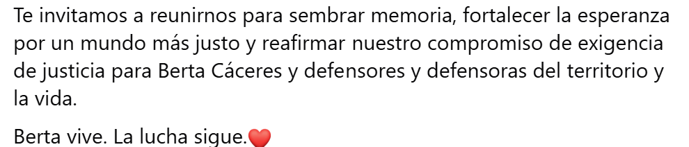 COPINH has posted on social media: “We invite you to gather to sow memory, strengthen hope for a more just world and reaffirm our commitment to demand justice for Berta Cáceres and defenders of the territory and life. Berta lives. The struggle continues.”
