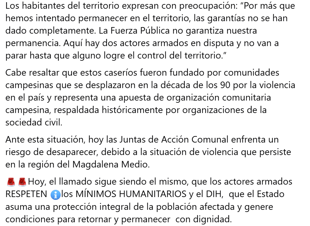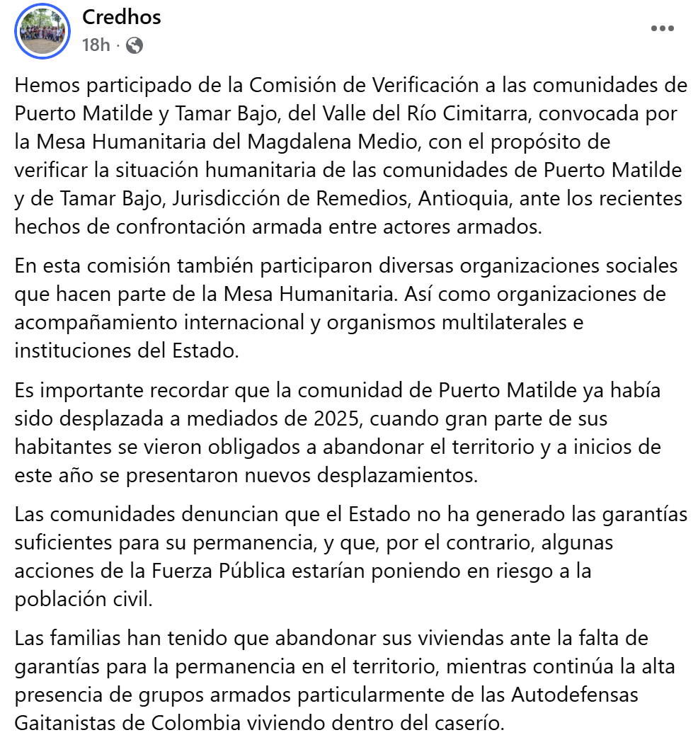“We participated in the Verification Commission for the communities of Puerto Matilde and Tamar Bajo, in the Cimitarra River Valley, convened by the Magdalena Medio Humanitarian Roundtable, with the purpose of verifying the humanitarian situation of the communities of Puerto Matilde and Tamar Bajo, Jurisdiction of Remedios, Antioquia, in light of the recent armed confrontations between armed actors.