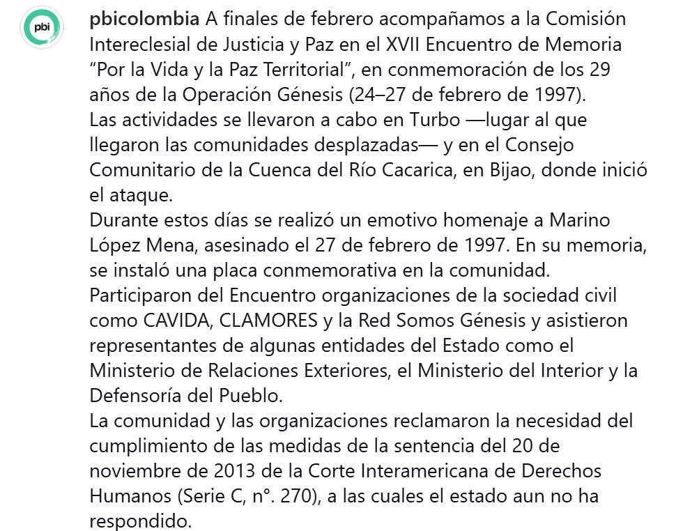 The Peace Brigades International-Colombia Project has posted on social media: