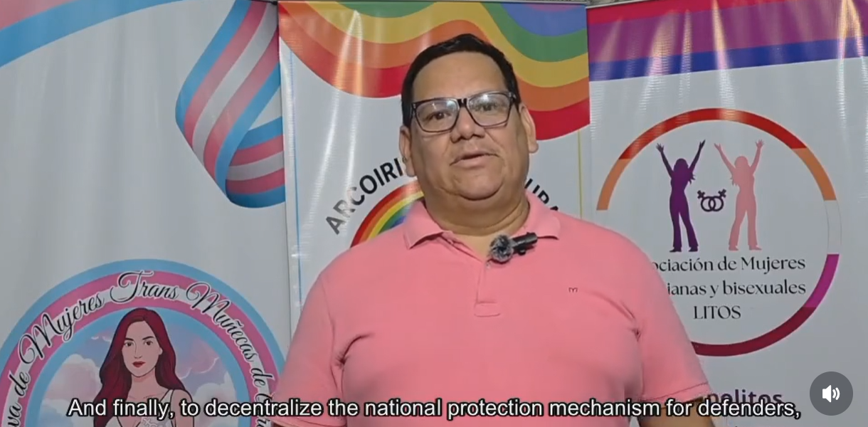 In the video, Reyes says: “The Sexual Diversity Committee of Honduras submitted 20 recommendations to the UPR [including] to decentralize and strengthen the national protection mechanism for defenders, promoting technical and financial resources for it.”