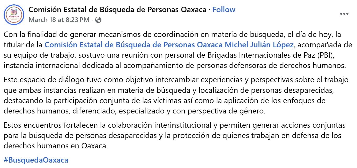 “With the aim of establishing coordination mechanisms for search operations, Michel Julián López, head of the Oaxaca State Commission for the Search for Missing Persons, accompanied by her team, held a meeting today with staff from Peace Brigades International (PBI), an international organisation dedicated to supporting human rights defenders.