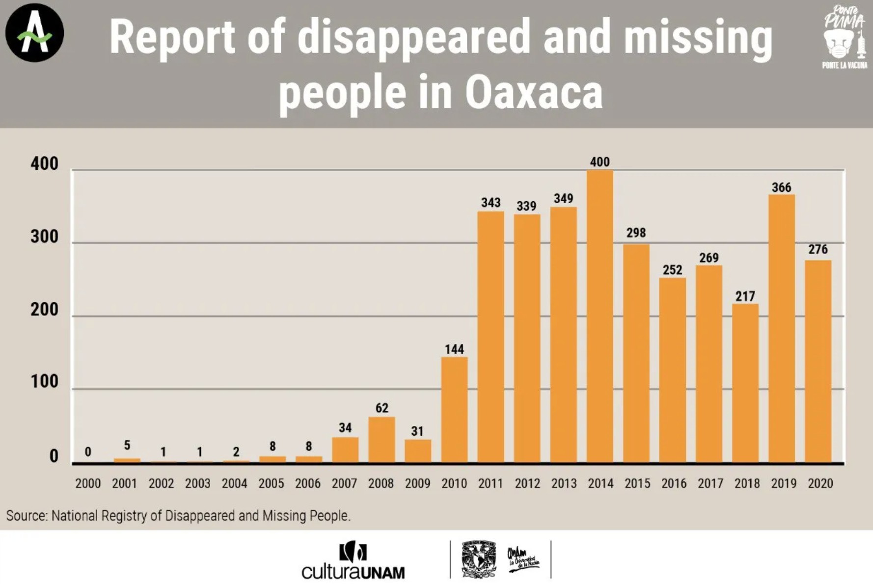 Corriente Alterna UNAM, the Journalistic Research Unit of the Coordination of Cultural Dissemination of the National Autonomous University of Mexico, has noted: “According to the National Registry of Disappeared and Missing People, 3,629 people have been reported disappeared or missing in the state of Oaxaca since 1964, with 90% of cases occurring during the last 10 years under the governments of Gabino Cué Monteagudo (2010-2016) and Alejandro Murat Hinojosa (2016-2022).”