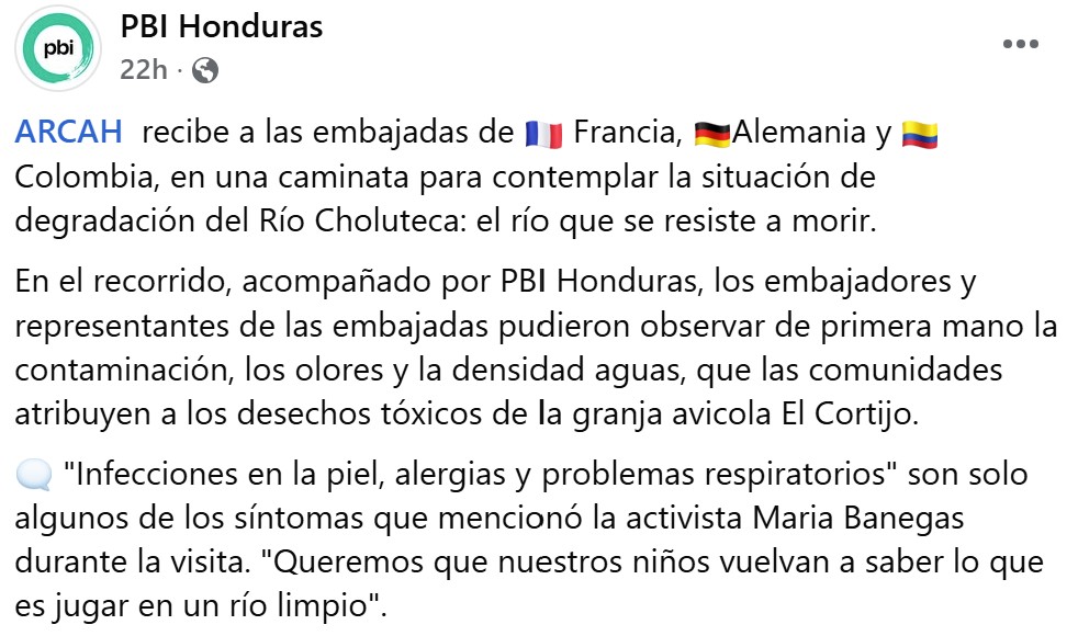 In January 2023, PBI-Honduras posted on social media: “Last week we visited again with ARCAH the community of Loarque. The Choluteca River and the people living around it in Tegucigalpa are heavily affected by the pollution, including the children who study in a school located nearby, as well as livestock. Since 2017, the year in which the poultry company ‘El Cortijo’ installed a chicken processor, people residing in the area are struggling to safeguard their health due to toxic waste and bad smells.”