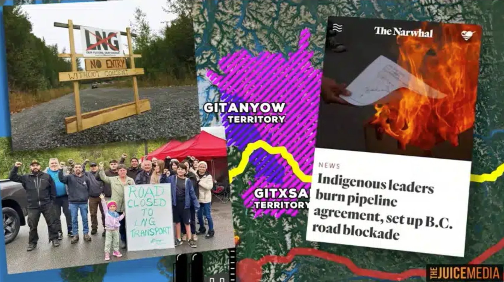 Image from the Juice Media video Honest Government Ad | Watch out, Canada about the PRGT pipeline and Ksi Lisims LNG terminal.