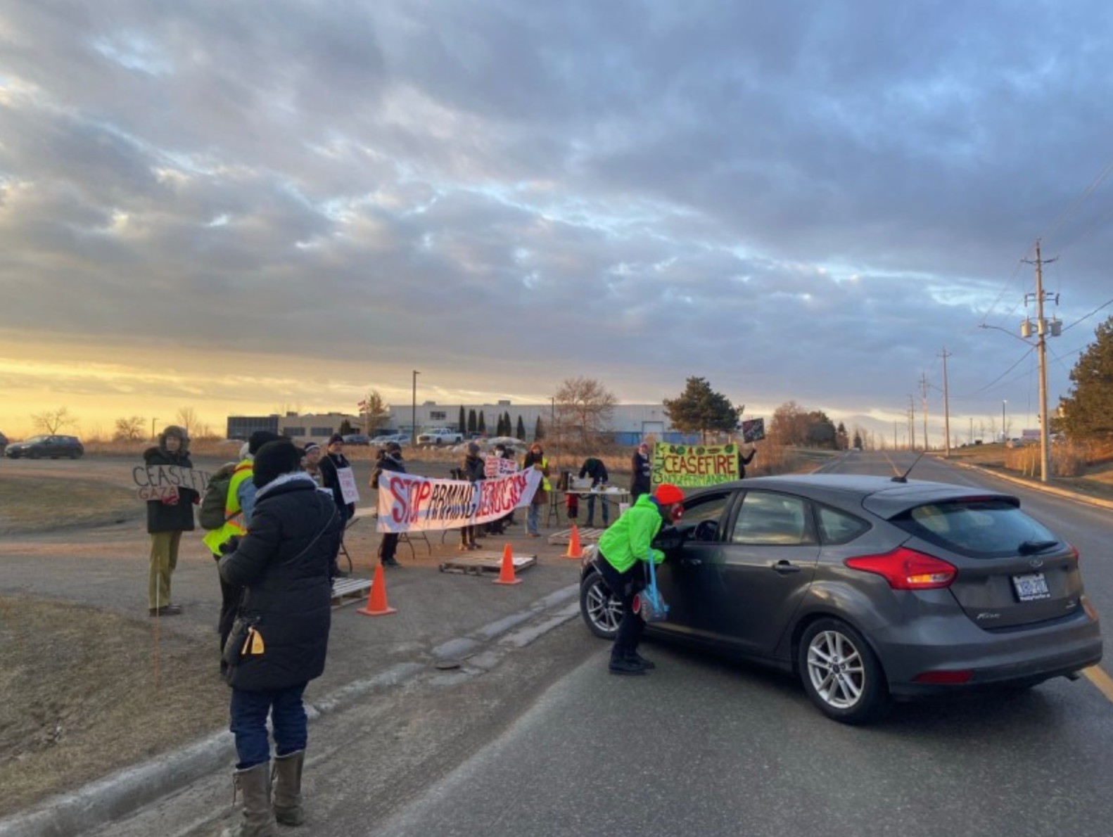 Photo: Organizers turn cars away during a shift change outside the Safran Electronics & Defense Canada Inc. facility in Peterborough, Ontario, Canada. Photo by Irene Suvillaga (Canadian Dimension magazine, March 2024).