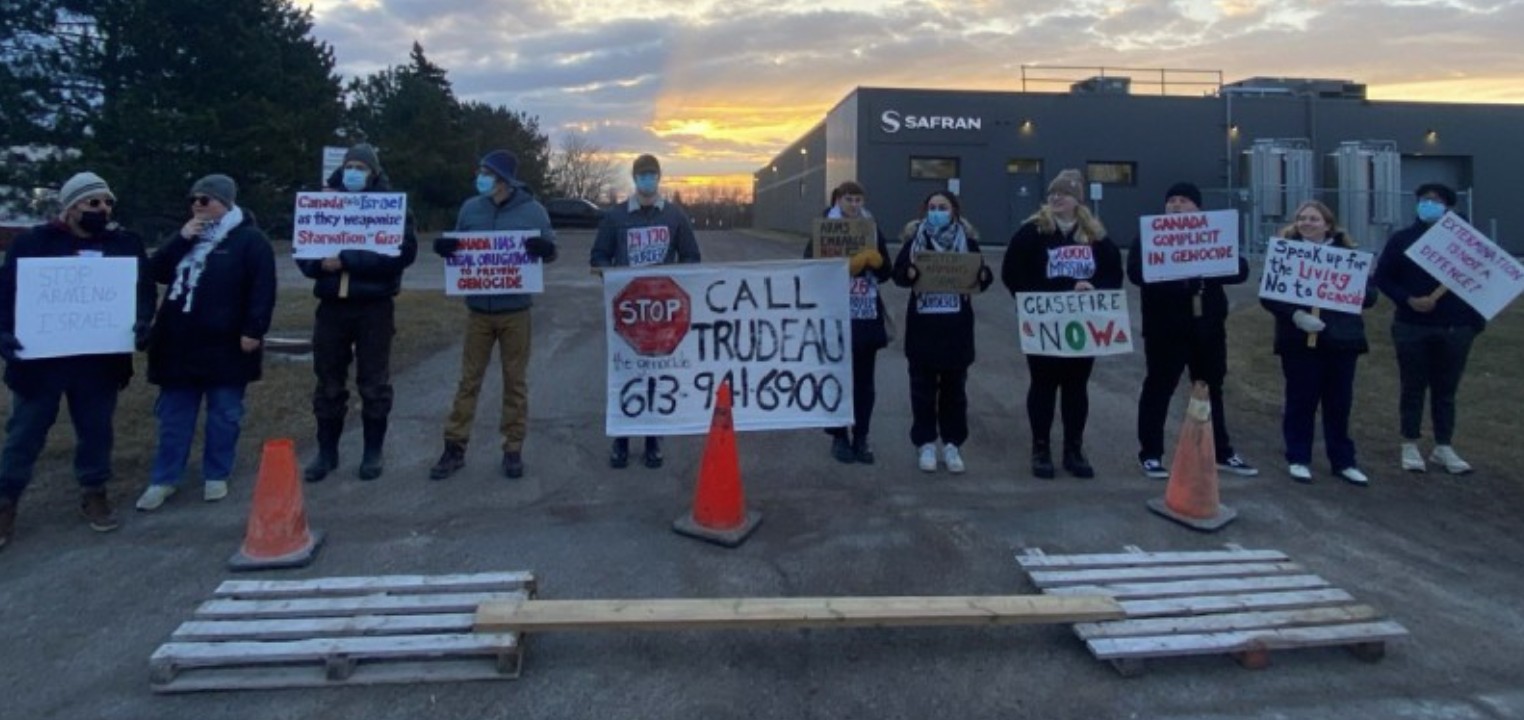Canadian Dimension further reports: “Just after dawn on February 26, a group of approximately 40 activists blocked both driveway entrances to the Safran Electronics & Defense Canada Inc. facility located in the south-end of Peterborough.”